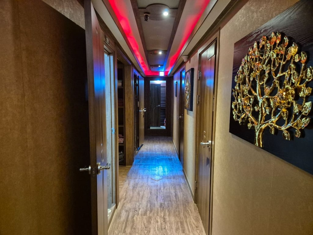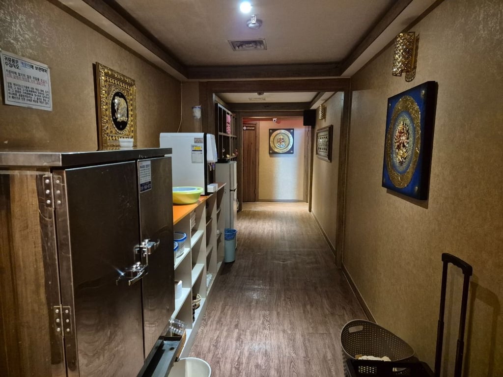 방 8개, 샤워장 2개, 관리샤 방 2개, 실장방, 족욕실, 부엌 및 창고.