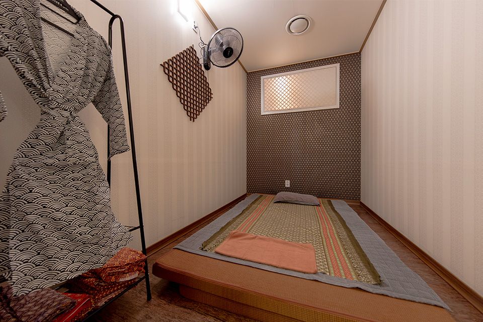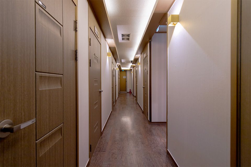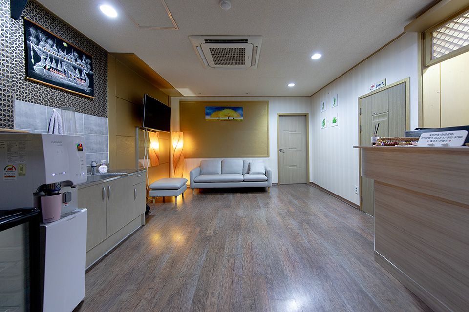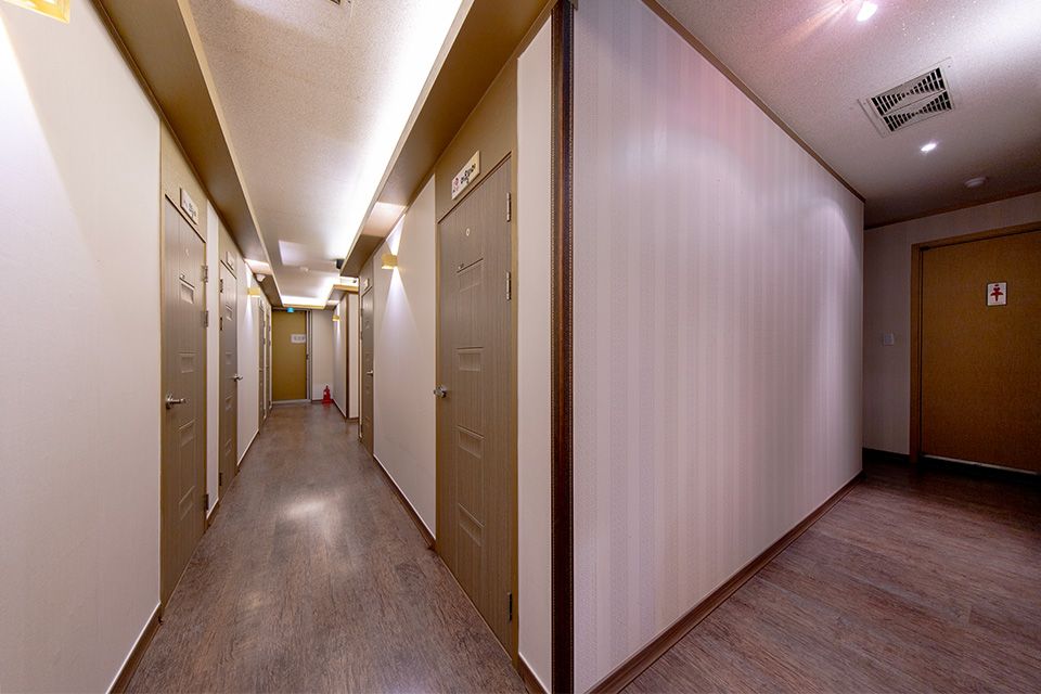 4층 건물 중 2층 전체 사용 중입니다. 출입문에서 안내데스크, 그 좌측으로 휴게공간 및 대형 룸 하나 있고 우측으로 1인룸 9개 있습니다. 남여 화장실, 샤워장 2개(1개는 세탁실로 사용 중) 매장 내에 있습니다. 야외 옥외 공간도 있습니다.